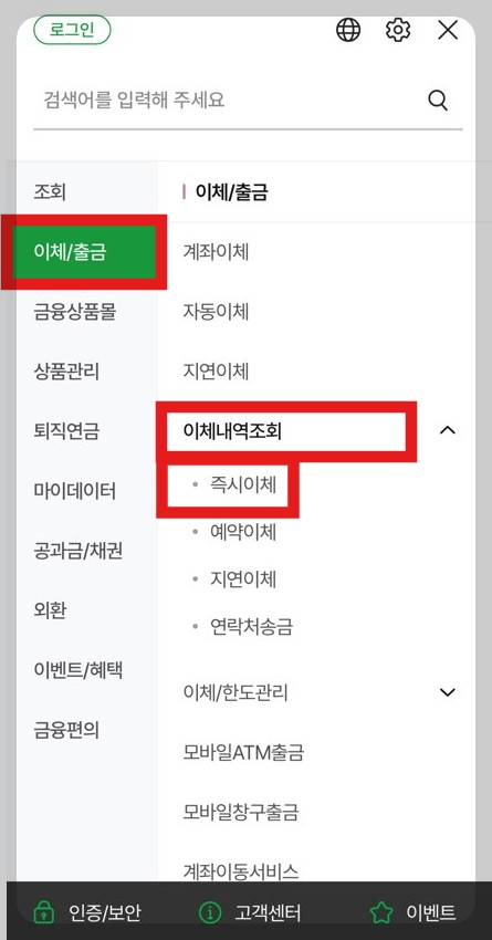 - 메인화면 → 전체메뉴 → 이체 → 이체내역조회 선택