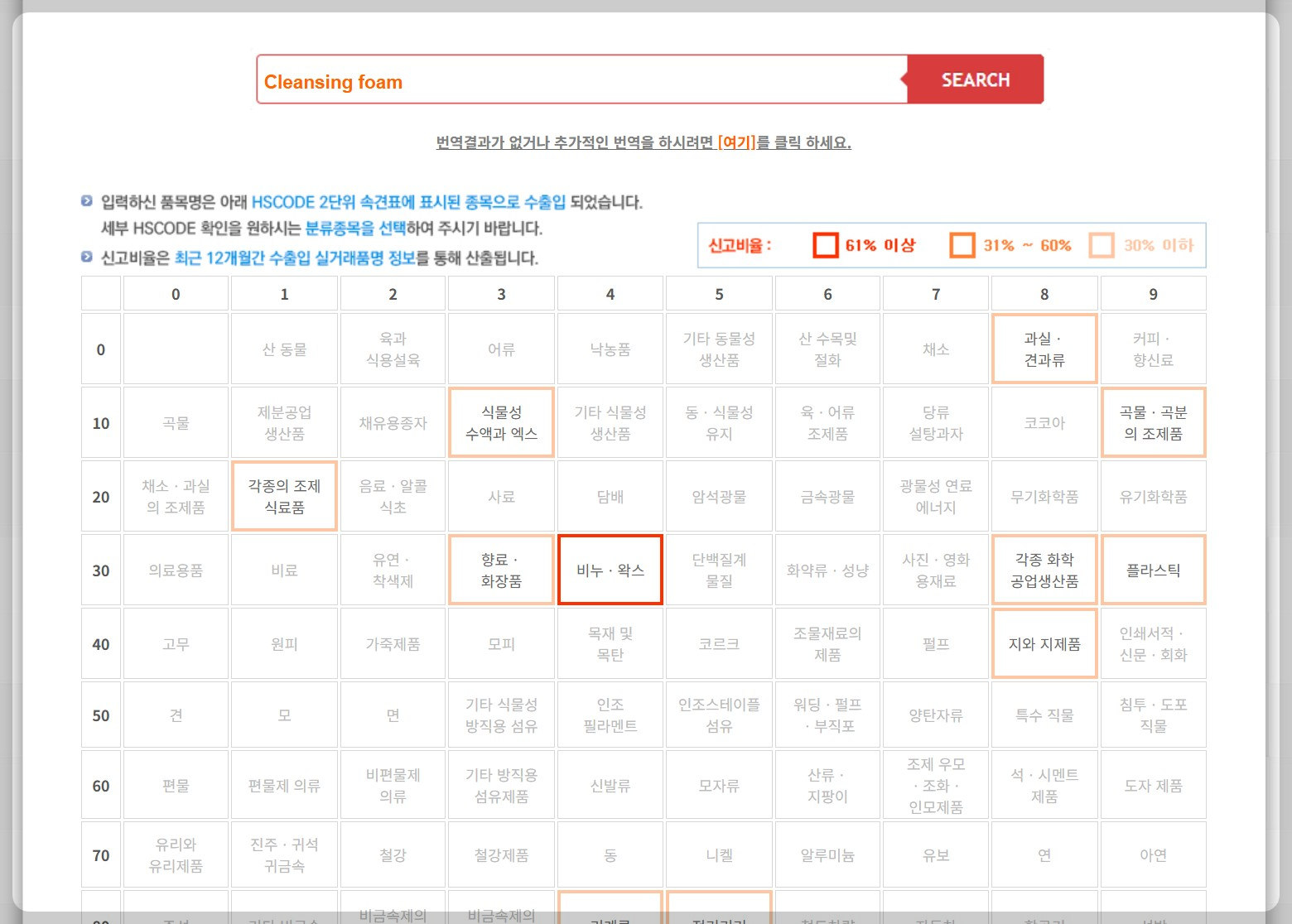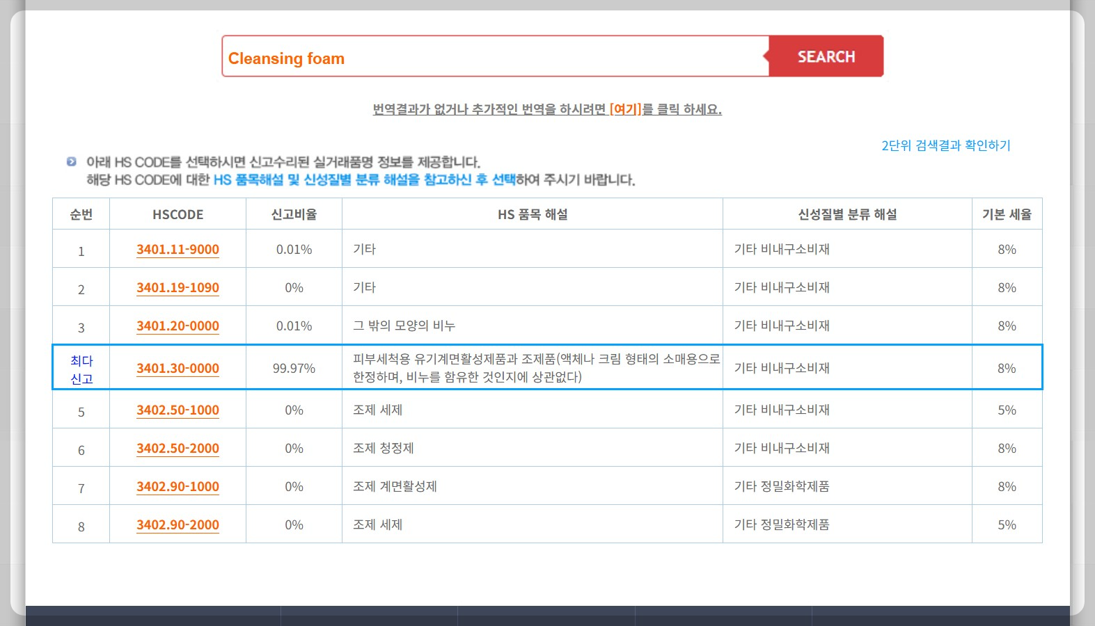 - 아래는 클렌징폼을 검색했을 때 예시이며, 클릭 1번으로 HS code 및 실제 최다 신고 빈도수를 확인하실 수 있습니다.
