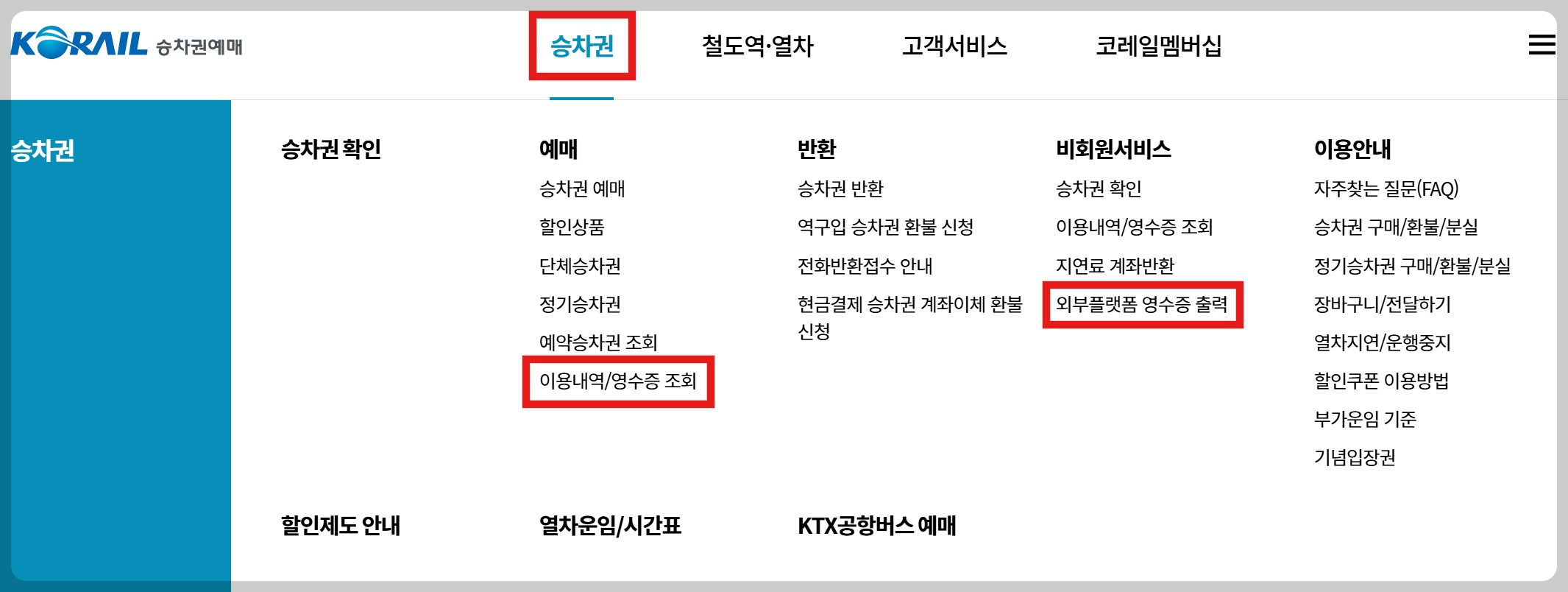 2: 상단 메뉴 → [승차권] → [발권/취소/변경] → [이용내역/영수증 출력] 클릭