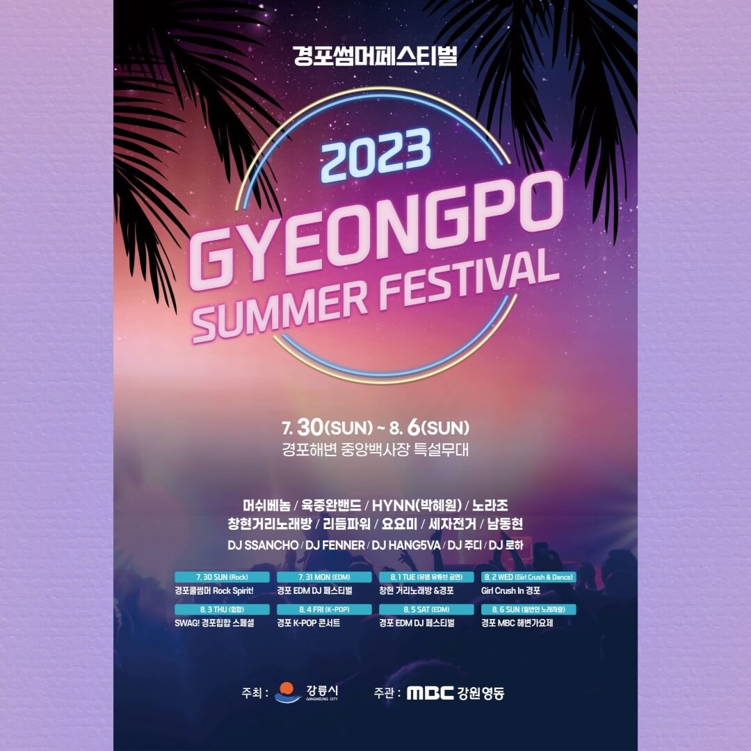 강릉 경포 해수욕장에서 펼쳐지는 해변 축제로 머쉬베놈, 노라조, 육중완밴드, HYNN 등 인기가수가 출연하는 대형 콘서트와 먹거리를 먹으며 휴식을 취할 수 있는 쿨썸머 파크, 경포 EDM 페스티벌 등 다양한 체험 프로그램이 펼쳐집니다.