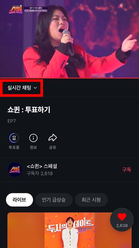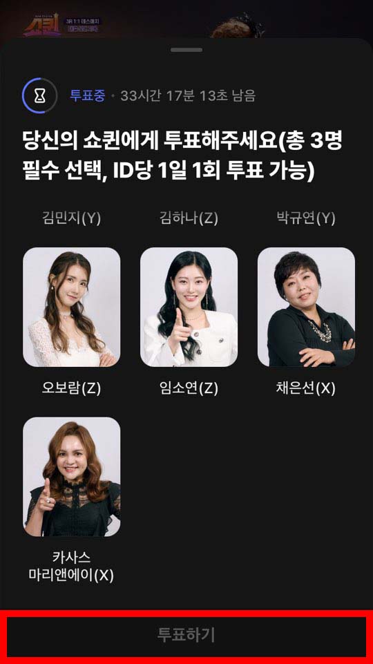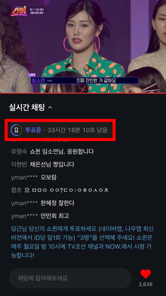 네이버 앱 메인 NOW 쇼퀸 선택 > 실시간 채팅 > 투표중 > 투표하기 (총 3명 필수 선택, ID당 1일 1회 투표가 가능)