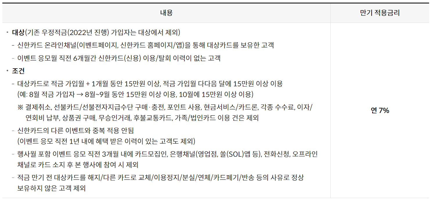 - 대상카드로 적금 가입월 + 1개월 동안 15만원 이상, 적금 가입월 다다음 달에 15만원 이상 이용