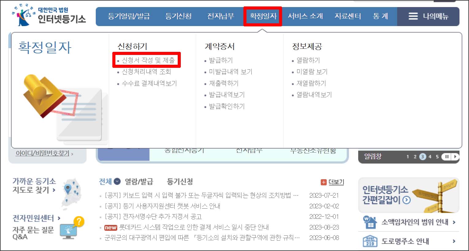 인터넷으로 확정일자를 받으실 경우 인터넷 등기소에 회원가입 후, 아래 절차를 따라주세요.