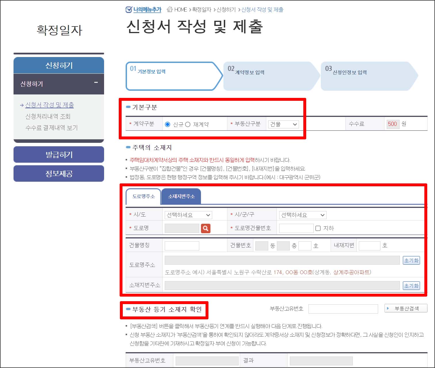 [회원가입] - [확정일자] - [신청서 작성 및 제출] 클릭 후, 계약구분, 부동산 구분, 주택의 소재지, 부동산 등기 소재지 등의 사항을 입력하시면 됩니다.