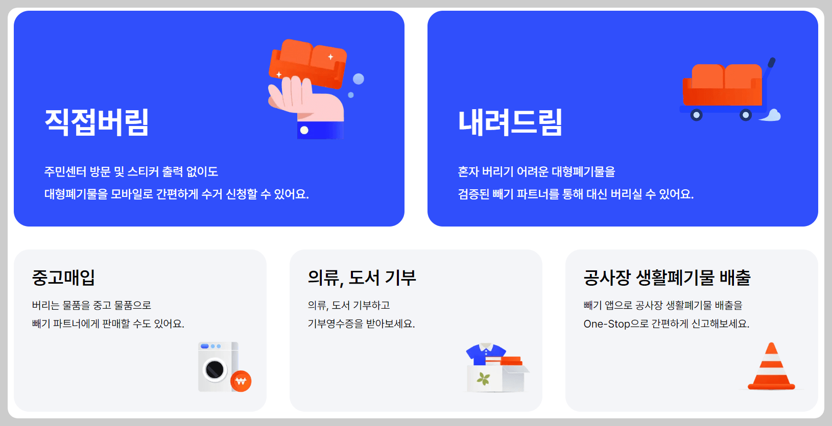 직접버림, 내려드림, 공사장 생활폐기물 배출신고, 중고판매 등 다양한 배출관련 서비스를 제공하며 이러한 이점으로 많은 지자체와 협약하여 쓰레기 배출 업무를 대행해주고 있는데요, 현재 아직 서비스를 시행하고 있지 않은 지역도 있으니 먼저 '서비스 가능지역 검색'을 통해 내 지역이 가능한 지 확인하고 해당 서비스 이용해보시기 바랍니다.