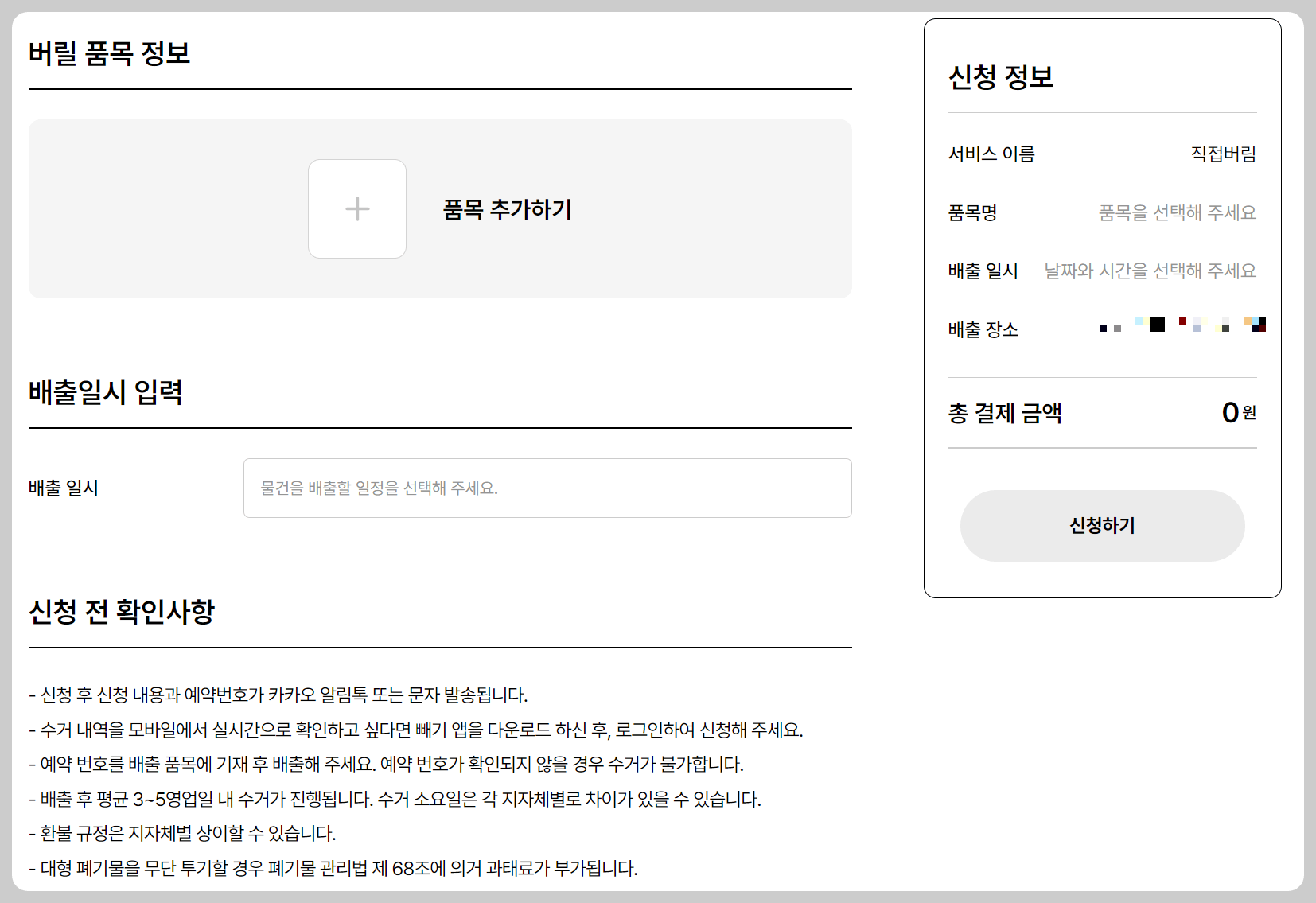 ② 우측 상단 [대형 폐기물 수거신청]을 누르고, 배출주소를 지정해주세요.