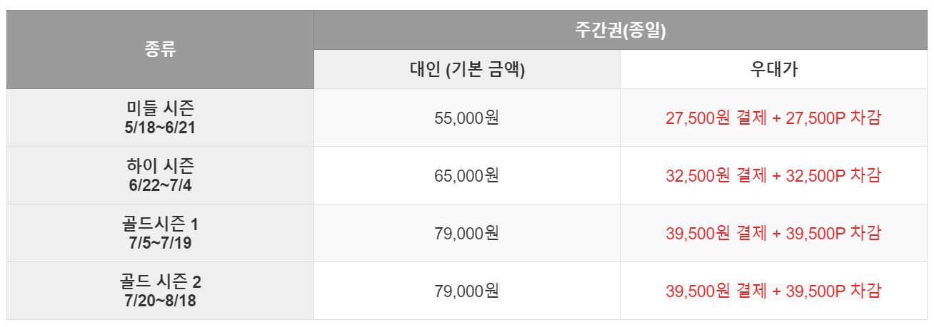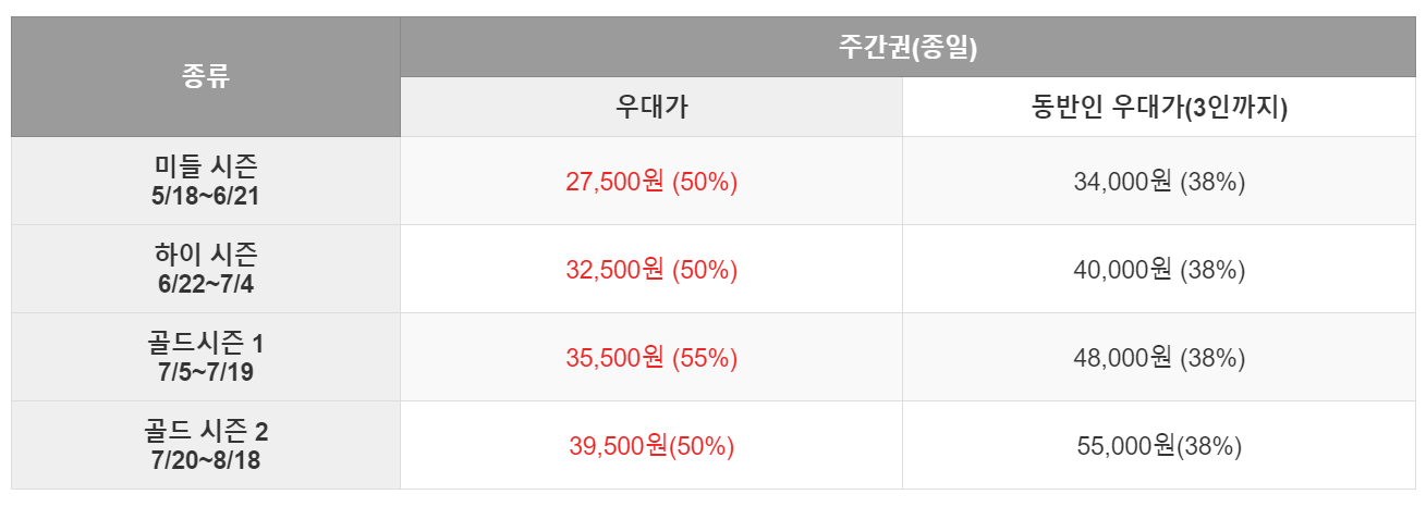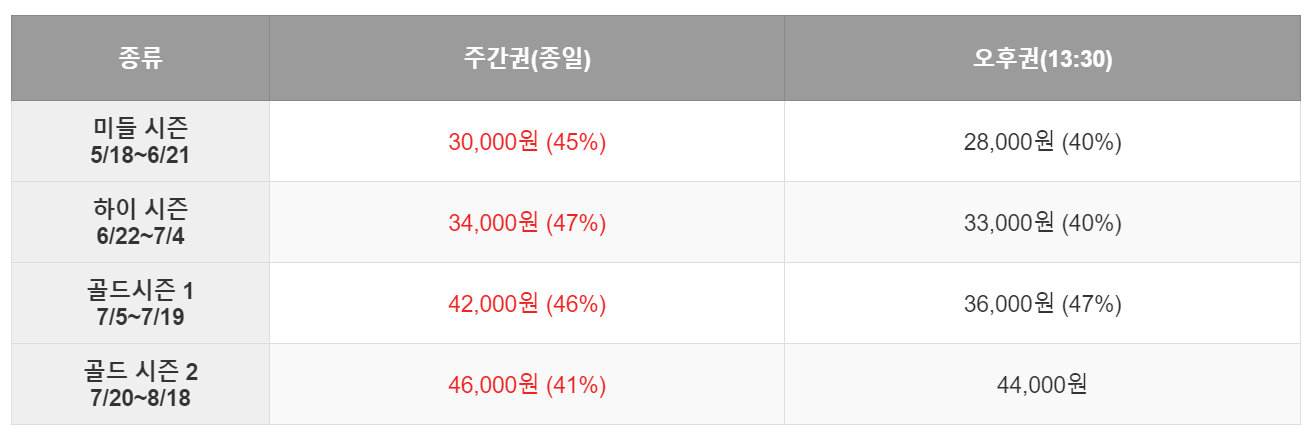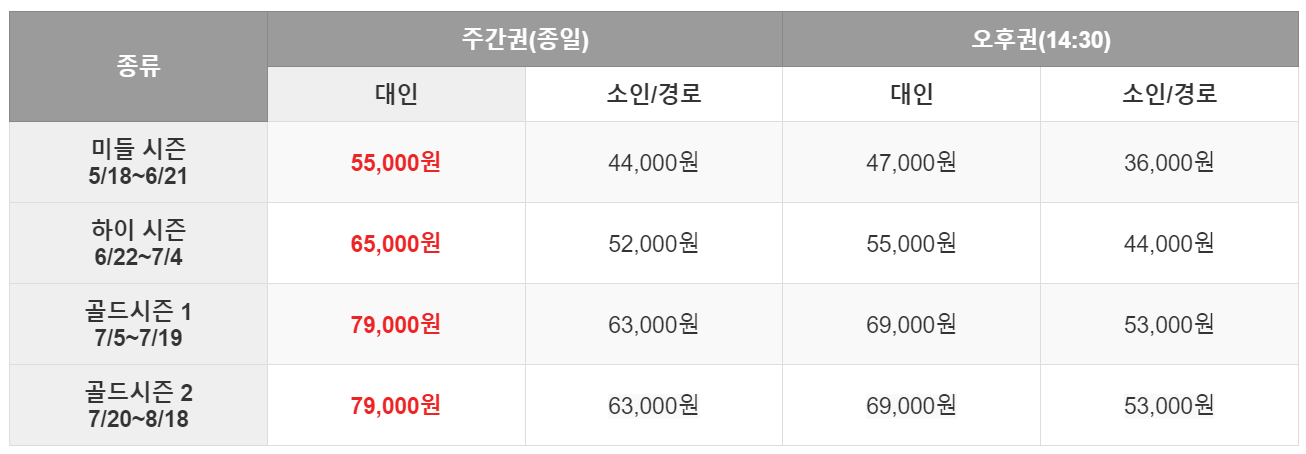 캐리비안베이 예매 요금은 비수기/성수기 시즌에 따라 다르게 구성됩니다. 2024년도 요금 아래에서 살펴보세요.