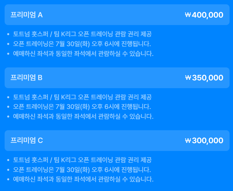K리그, 토트넘 경기는 프리미엄A 티켓 40만원부터 시작합니다. 프리미엄 좌석은 오픈 트레이닝 관람 권리가 함께 제공되며, 오픈 트레이닝은 경기 전날인 7월 30일(화) 오후 6시에 진행됩니다.