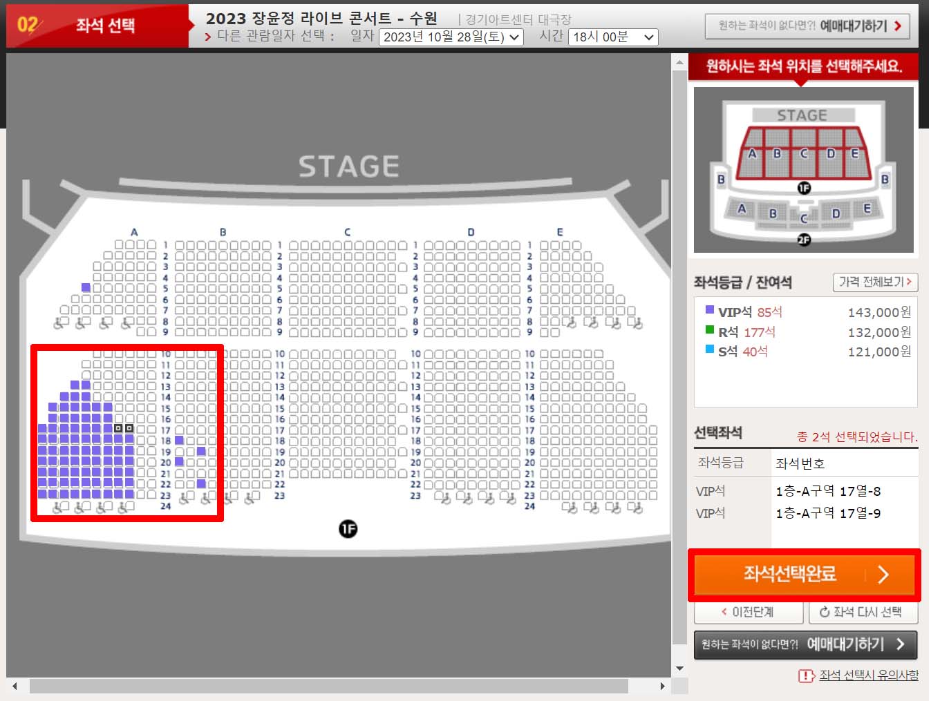 ② [좌석] 클릭 - [좌석선택완료] 클릭