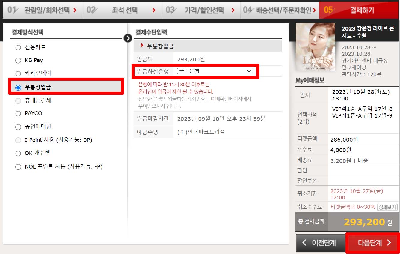 ⑤ [결제방식] 클릭 - [입금하실은행] 선택 - [다음단계] 클릭하면 예매 완료